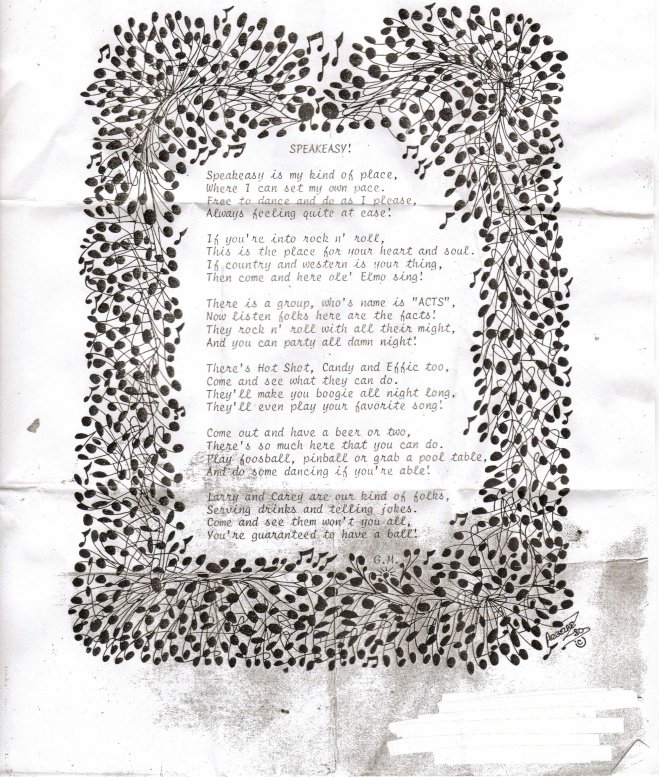 Here's a poem about Speakeasy penned by Gay Melton Jansen, the first female bartender hired by Sarge!